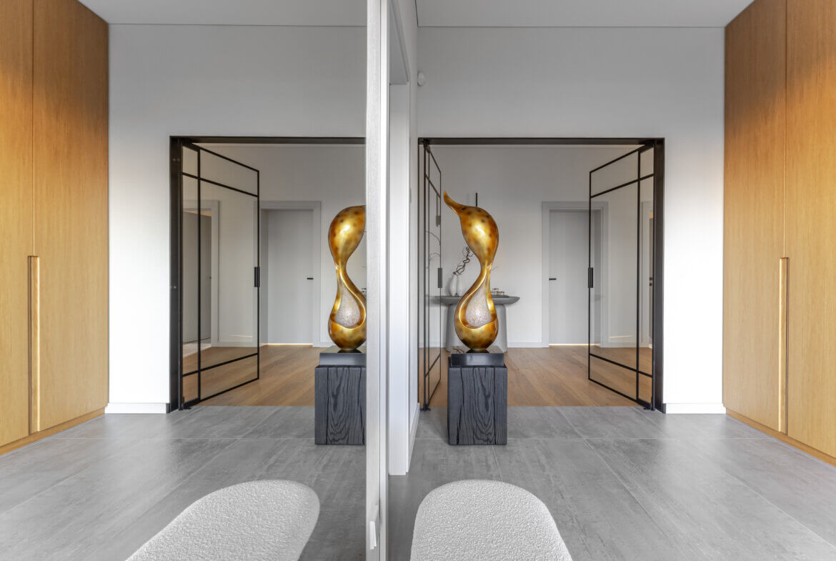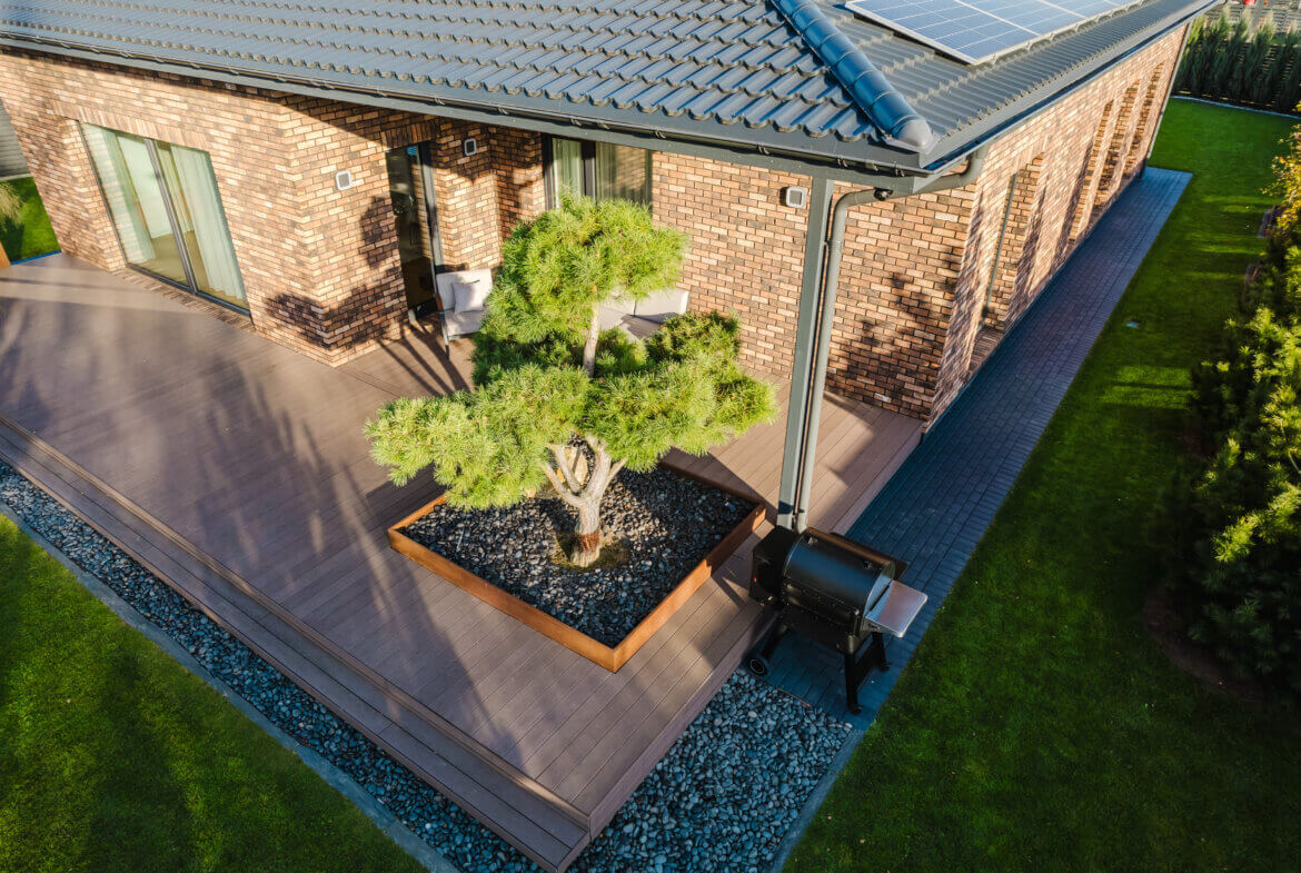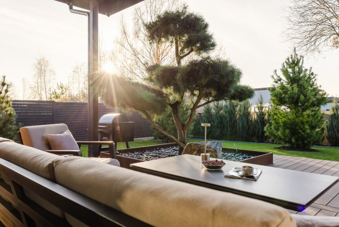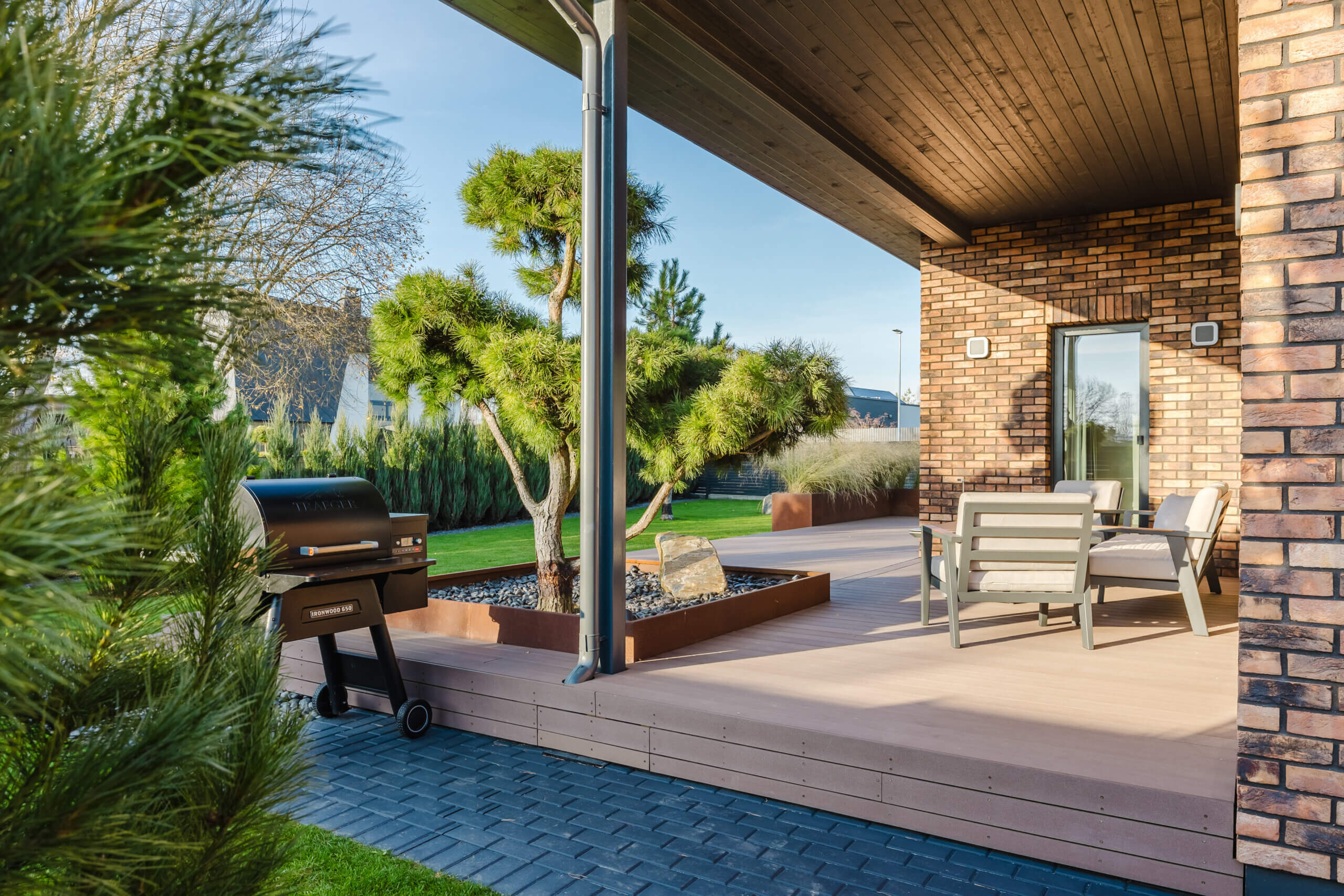 Iš svetainės atsiveria nuo lietaus dengta 56 m² terasa – šviesos ir gryno oro kupina erdvė, kurioje galima mėgautis tyla, vakarais stebėti, kaip krinta saulės spinduliai ant žalumos, ar tiesiog nurimti įsitaisius ant terasos minkštų krėslų. Kiemas – tarsi mažas japoniškas sodas, kuriame augalai, apšvietimas ir natūralūs akmenys sukuria subtilų prabangos įspūdį.