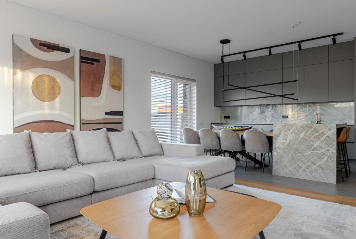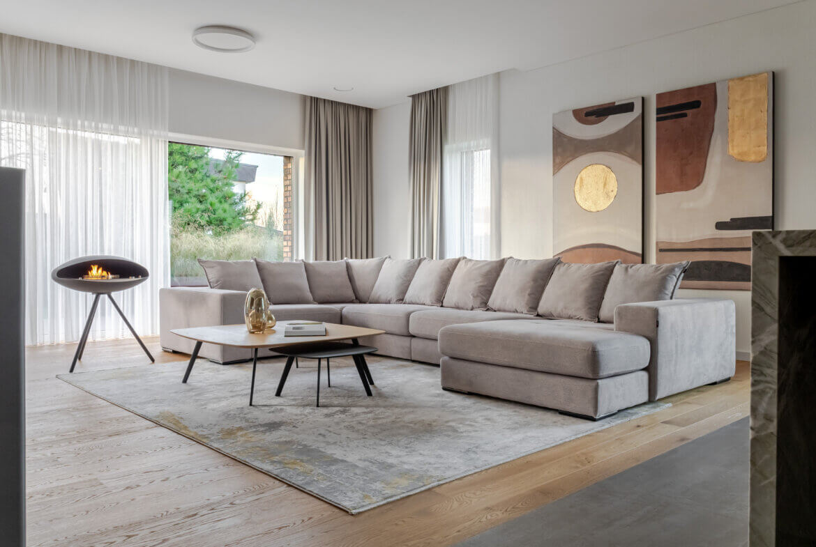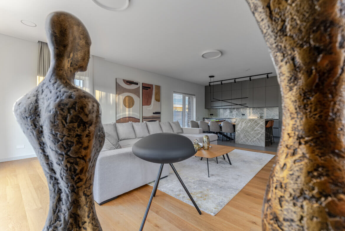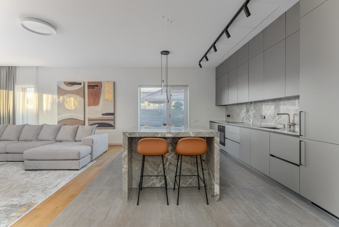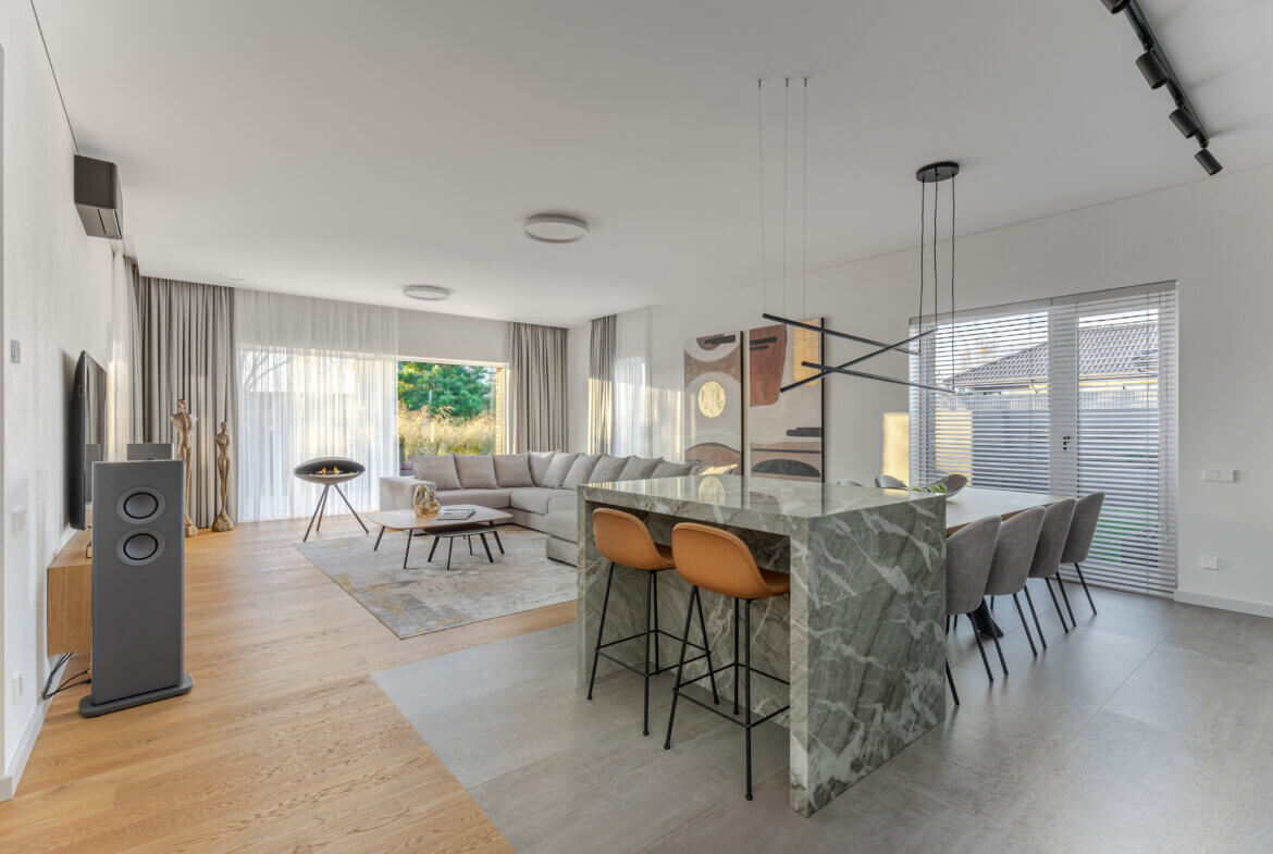 Vos įžengus į vidų, pajunti lengvumą. 3 metrų aukščio lubos, natūralus ąžuolas, subtilūs tonai ir pro langus įsiveržianti šviesa sukuria ramybės ir harmonijos jausmą. Atvira 58 m² svetainės, valgomojo ir virtuvės erdvė – tai vieta šeimos susitikimams, pokalbiams prie židinio ar vakaro kino seansui su integruota „KEF“ garso sistema. Virtuvėje estetika susilieja su funkcionalumu: natūralaus kvarcito „Vitoria Luxe“ sala, „Miele“ buitinė technika, individualiai pagal užsakymą gaminti ąžuolo fasado baldai su „Blum“ furnitūra. Čia kiekvienas elementas kalba apie kokybę ir šeimininkų vertinamą ilgaamžiškumą. Tai erdvė, sukurta sekmadienio rytams – kai keptuvėje čirška blynai, namuose skamba juokas, o skambanti muzika aukštų lubų erdvėje atranda gyventojų nuotaiką. Vakarais namai virsta ramybės vieta, kur švelni šviesa, komfortiški ispaniški baldai ir „LightPro“ apšvietimas sukuria jaukią, subtilios prabangos atmosferą.