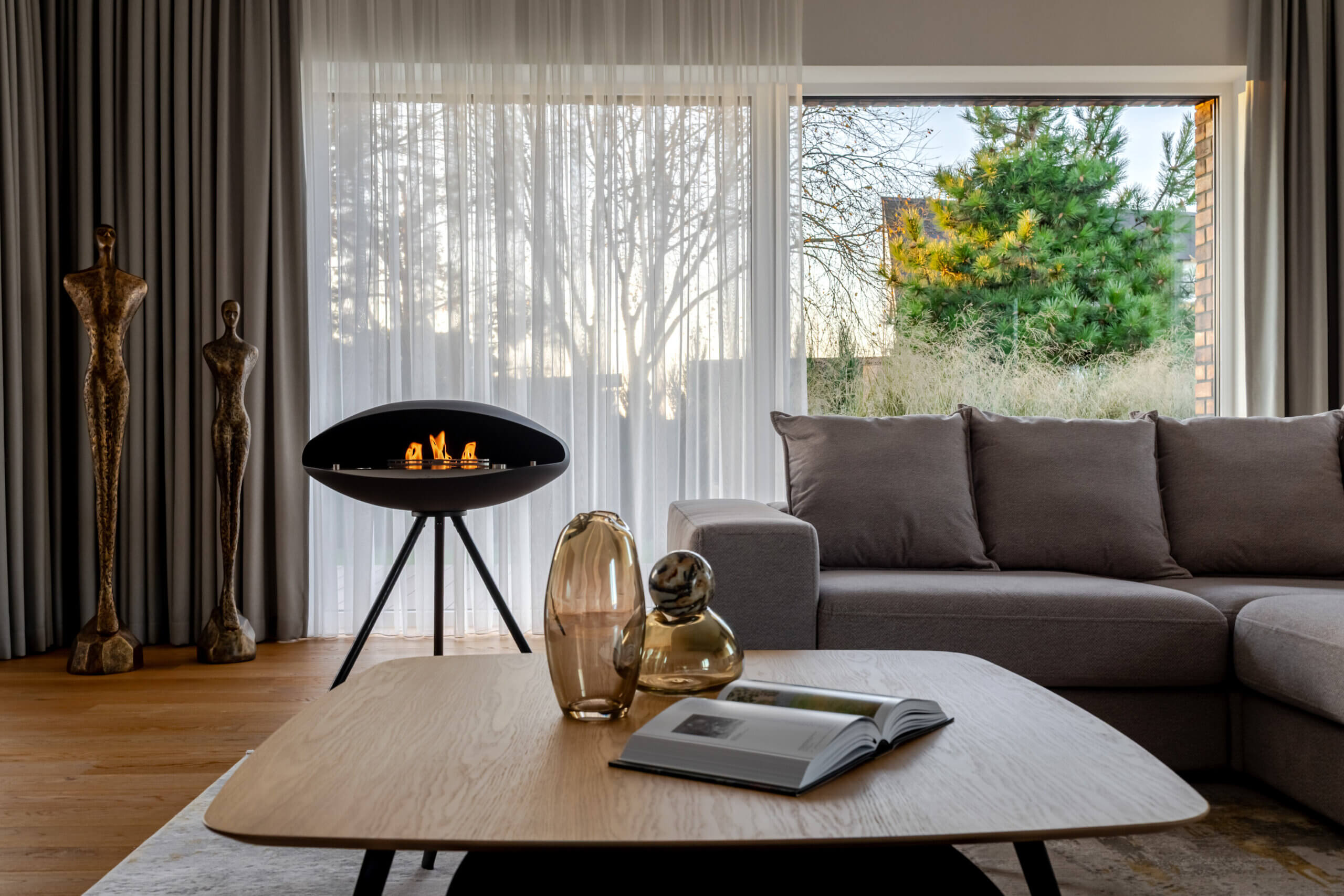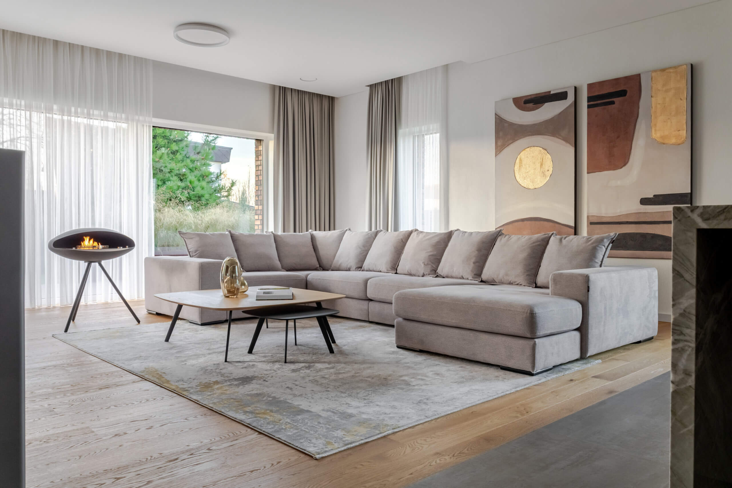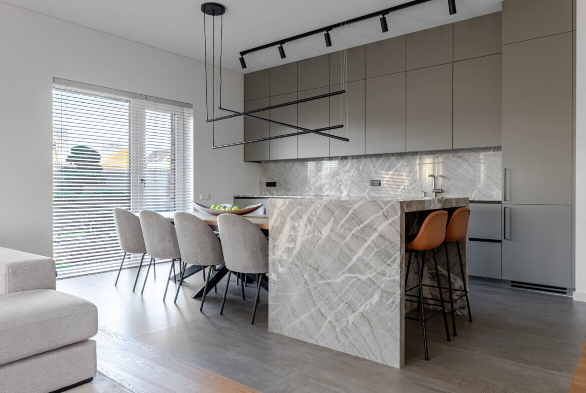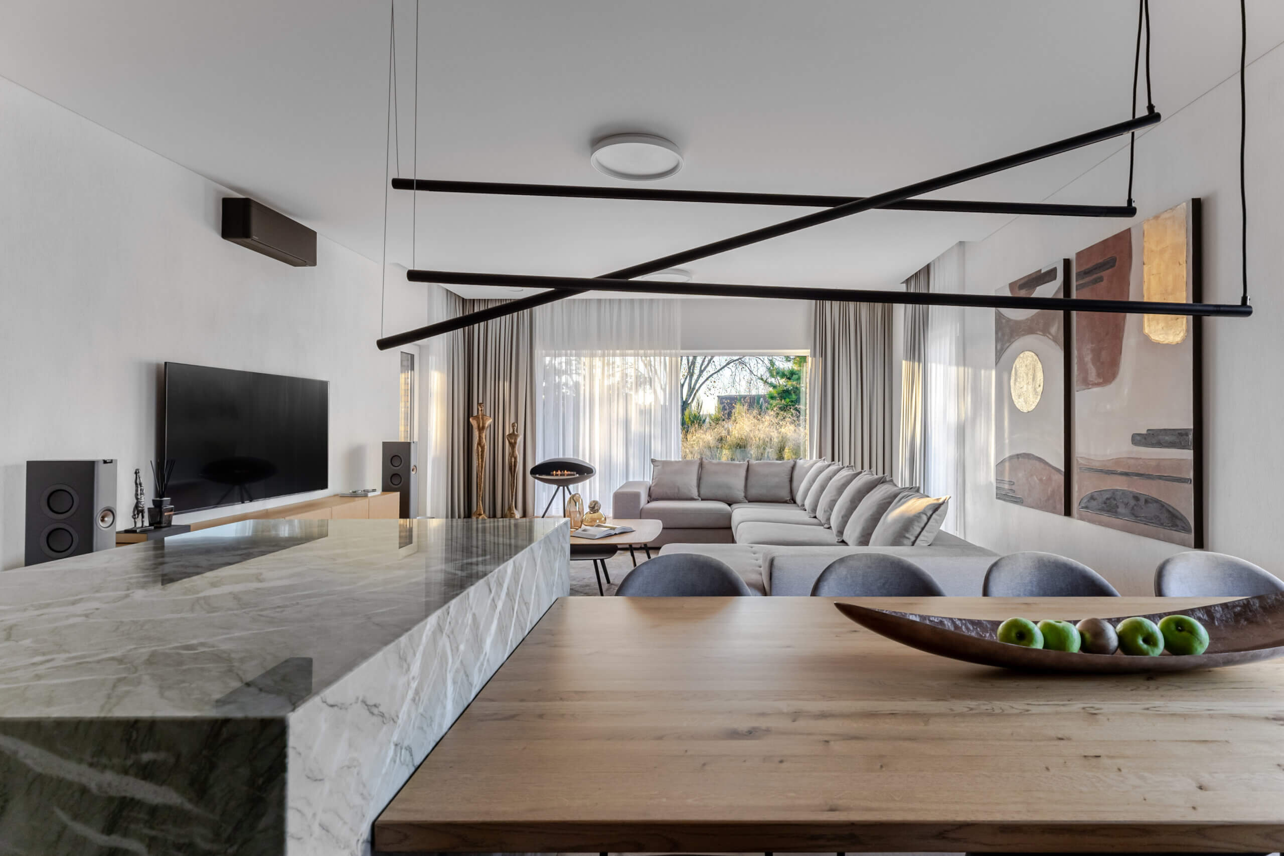 Vos įžengus į vidų, pajunti lengvumą. 3 metrų aukščio lubos, natūralus ąžuolas, subtilūs tonai ir pro langus įsiveržianti šviesa sukuria ramybės ir harmonijos jausmą. Atvira 58 m² svetainės, valgomojo ir virtuvės erdvė – tai vieta šeimos susitikimams, pokalbiams prie židinio ar vakaro kino seansui su integruota „KEF“ garso sistema. Virtuvėje estetika susilieja su funkcionalumu: natūralaus kvarcito „Vitoria Luxe“ sala, „Miele“ buitinė technika, individualiai pagal užsakymą gaminti ąžuolo fasado baldai su „Blum“ furnitūra. Čia kiekvienas elementas kalba apie kokybę ir šeimininkų vertinamą ilgaamžiškumą. Tai erdvė, sukurta sekmadienio rytams – kai keptuvėje čirška blynai, namuose skamba juokas, o skambanti muzika aukštų lubų erdvėje atranda gyventojų nuotaiką. Vakarais namai virsta ramybės vieta, kur švelni šviesa, komfortiški ispaniški baldai ir „LightPro“ apšvietimas sukuria jaukią, subtilios prabangos atmosferą.