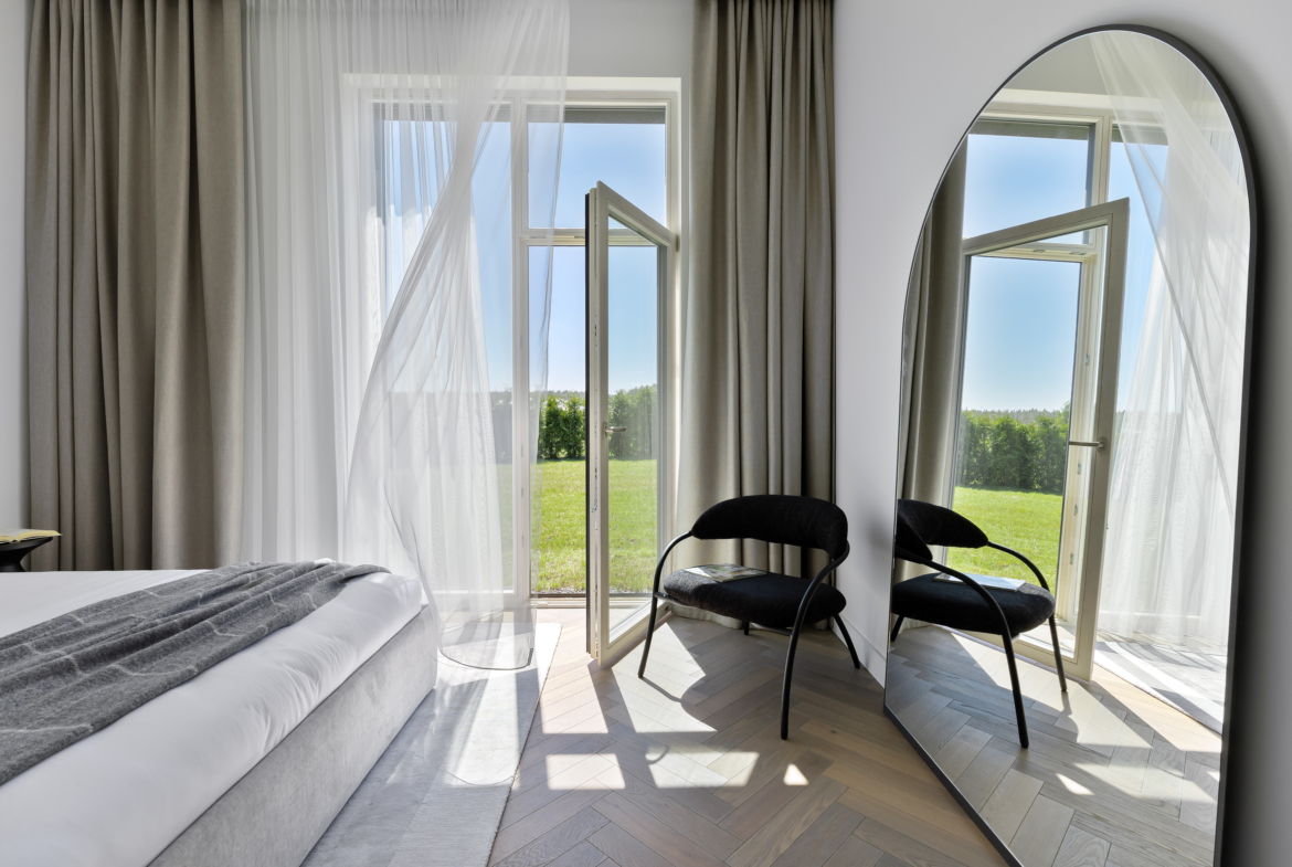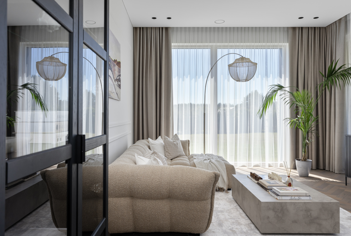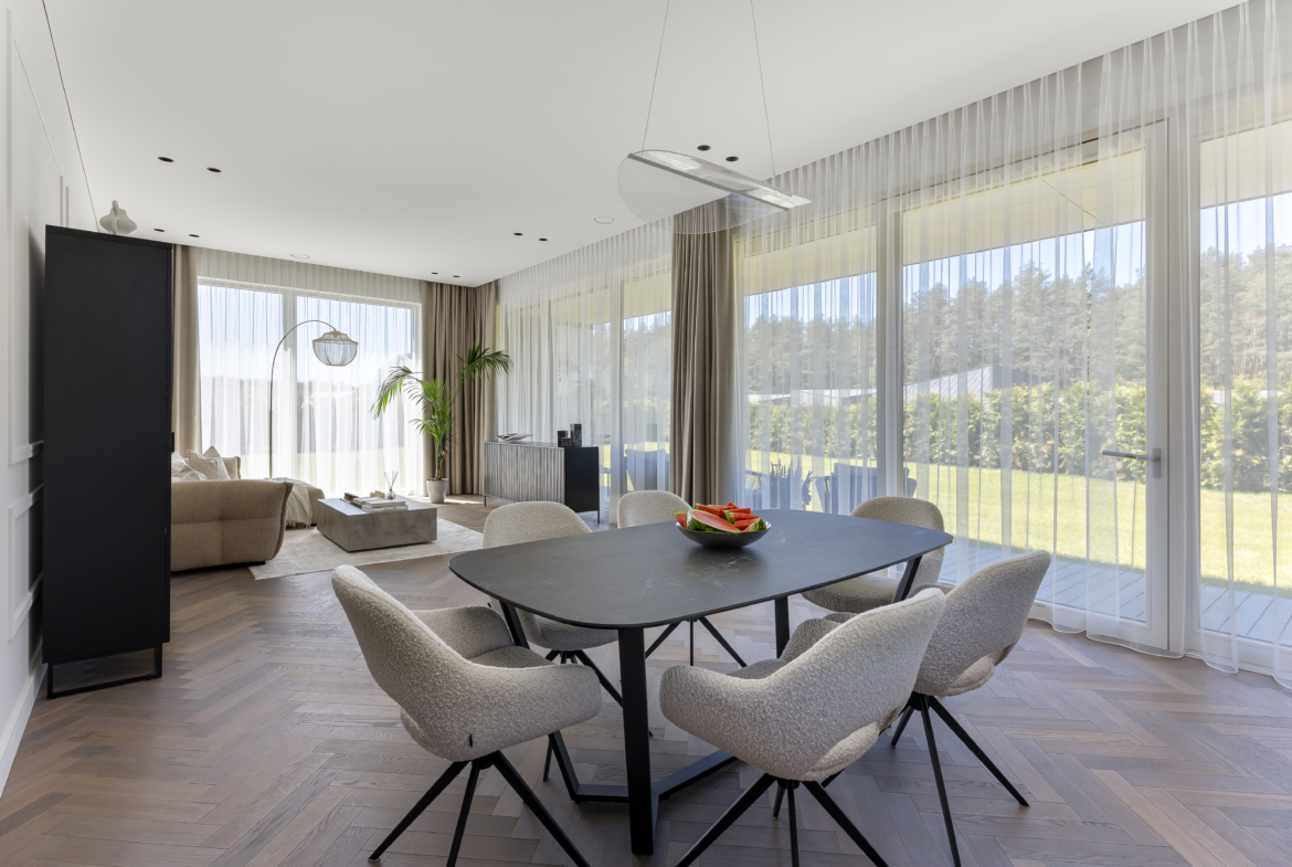 Šviesus ir jaukus interjeras, kuriame vyrauja žemiškų pastelinių spalvų paletė, natūraliai susilieja su aplinkos peizažu ir kuria subtilią ramybės atmosferą. Kiekviena erdvė kruopščiai apgalvota, siekiant maksimalaus funkcionalumo, estetikos ir gyvenimo kokybės.Namas parduodamas su visais jame esančiais baldais ir buitine technika, tad naujakuriai gali iš karto mėgautis jaukumu ir patogumu be papildomų rūpesčių.
