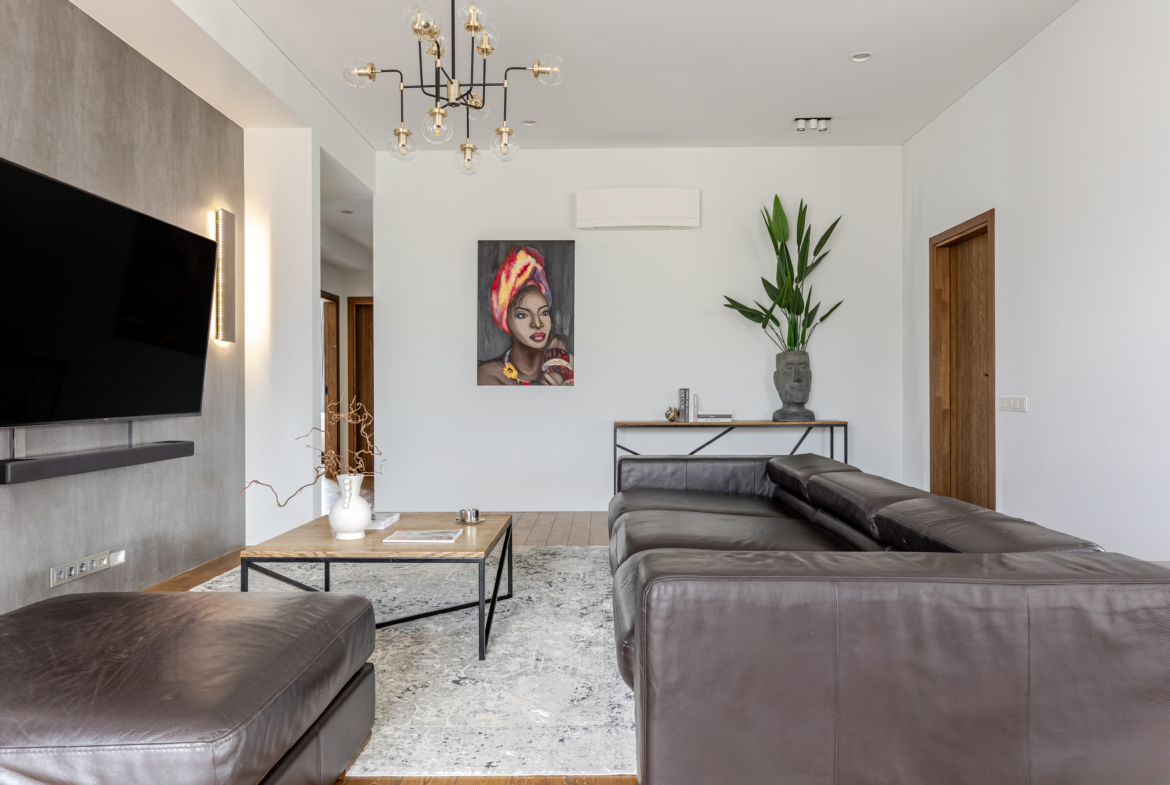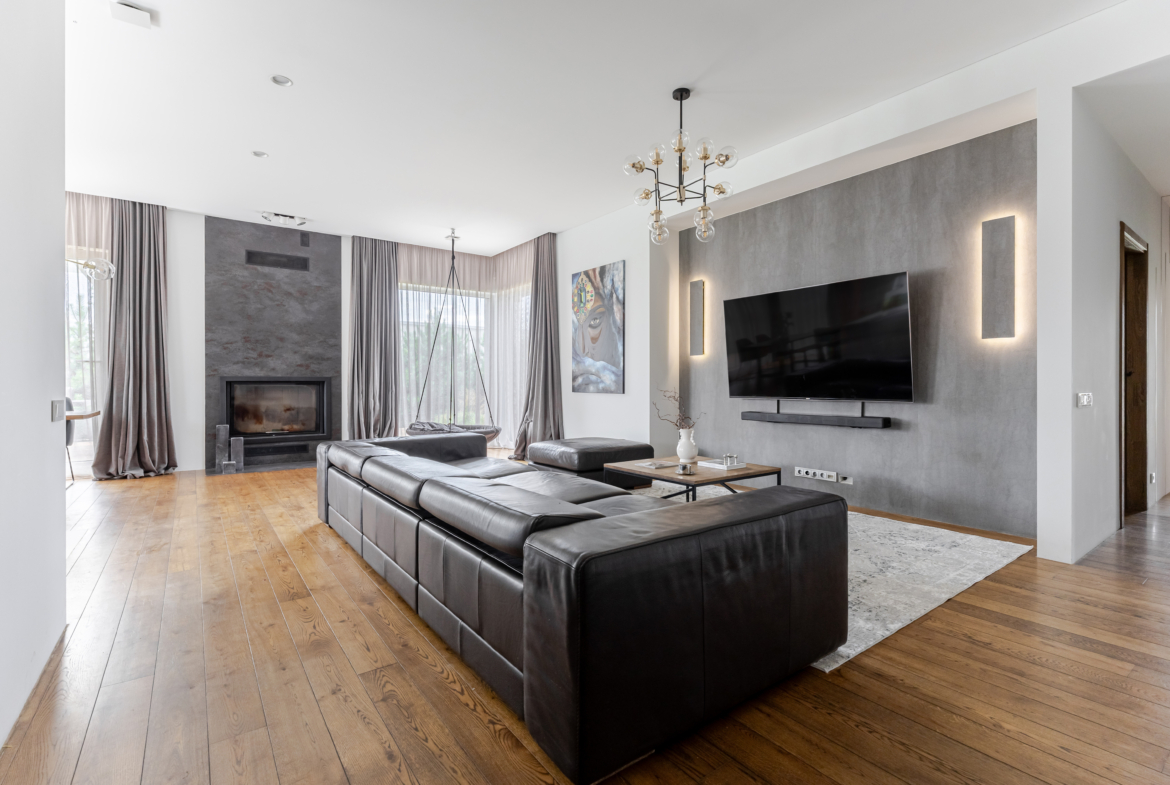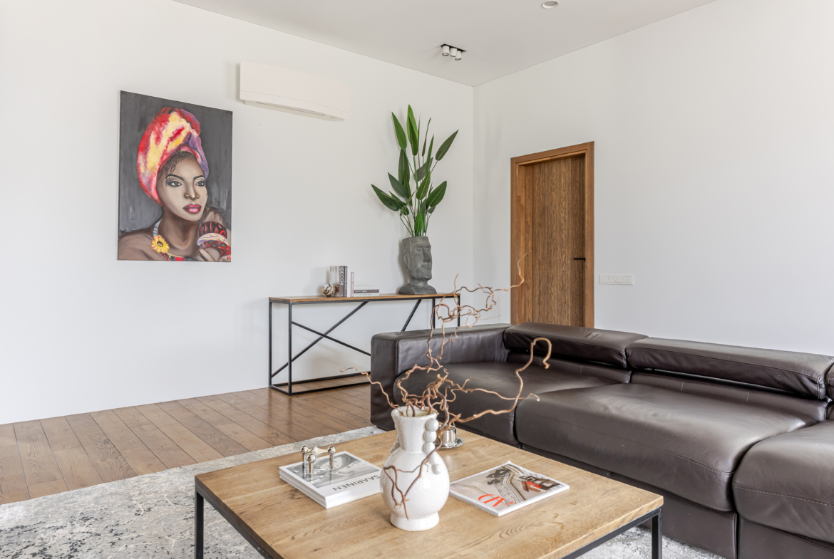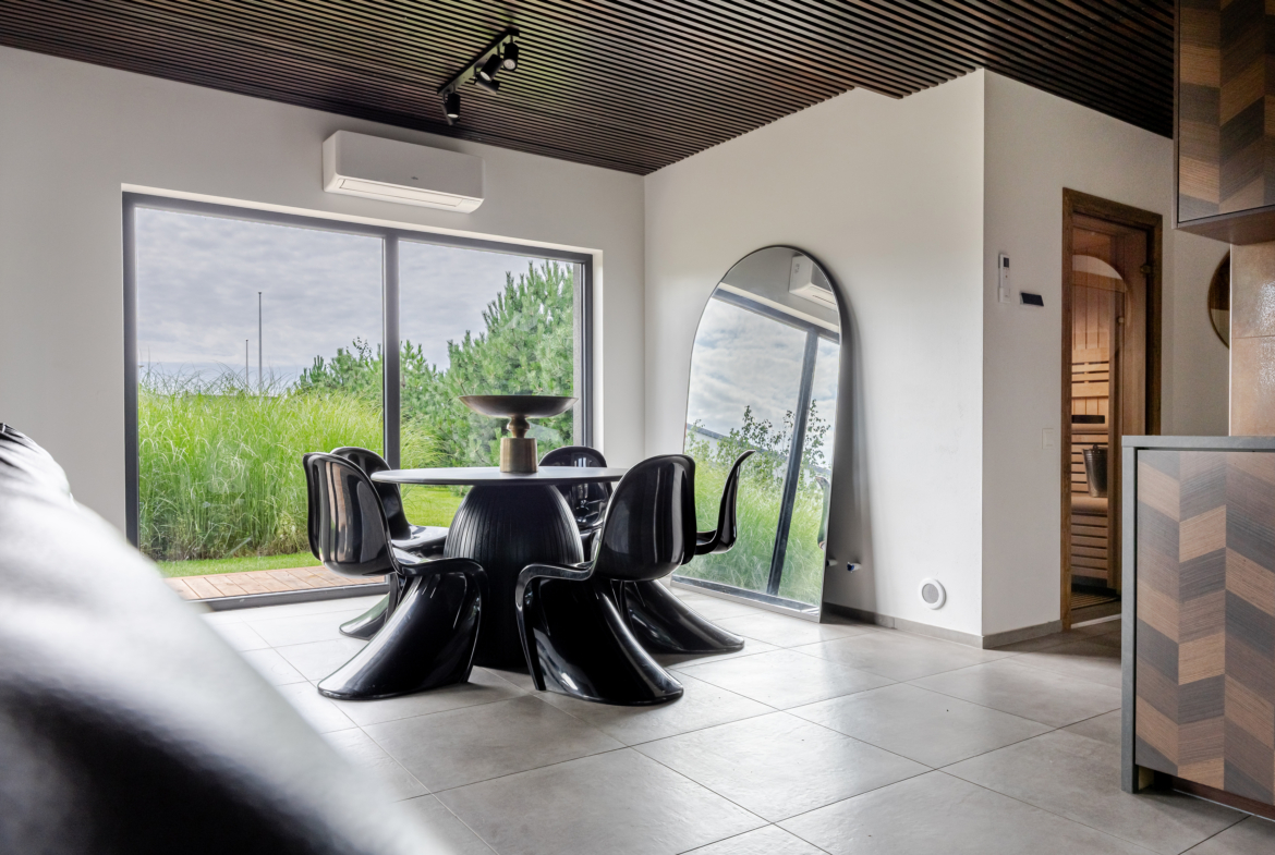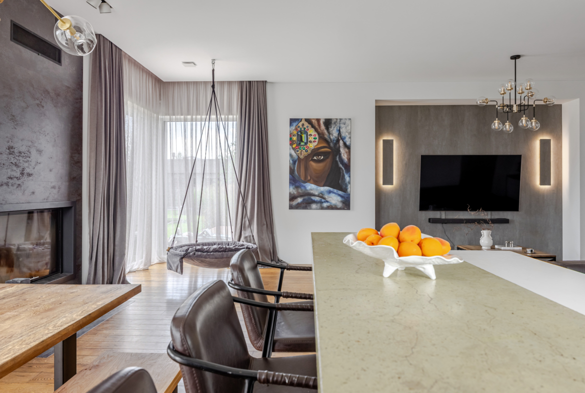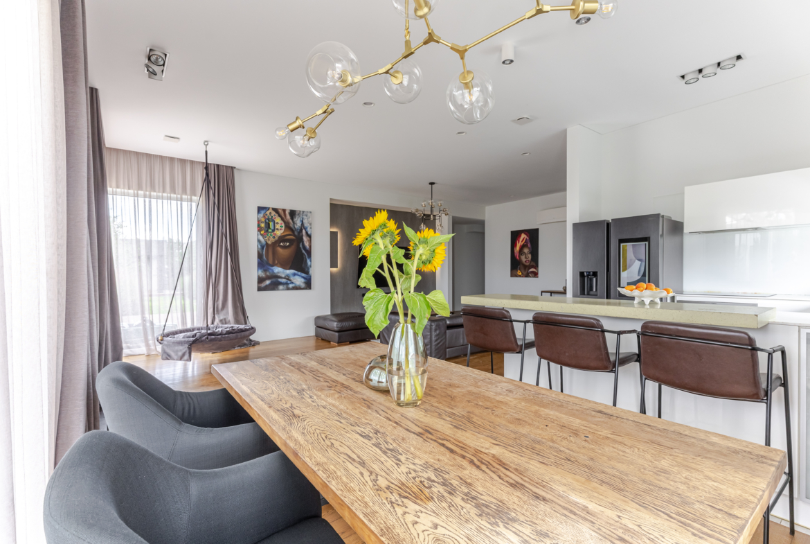 Vieno aukšto namas – dažna šeimos svajonė, vertinantiems komfortą ir gyvenimą be laiptų. 178 kv. m gyvenamasis plotas išsiskiria erdviu bei apgalvotu interjeru, kurį formuoja natūralios medžiagos, kruopščiai parinkti modernaus interjero dizaino sprendimai ir aukštos kokybės apdaila. Svetainė sujungta su virtuve bei valgomuoju į vientisą, šviesią bendrą zoną, kurioje dominuoja natūralus ąžuolo parketas, elegantiški šviestuvai, moderni buitinė technika bei išskirtinės detalės. O supynės? Dar viena šypseną kelianti detalė.