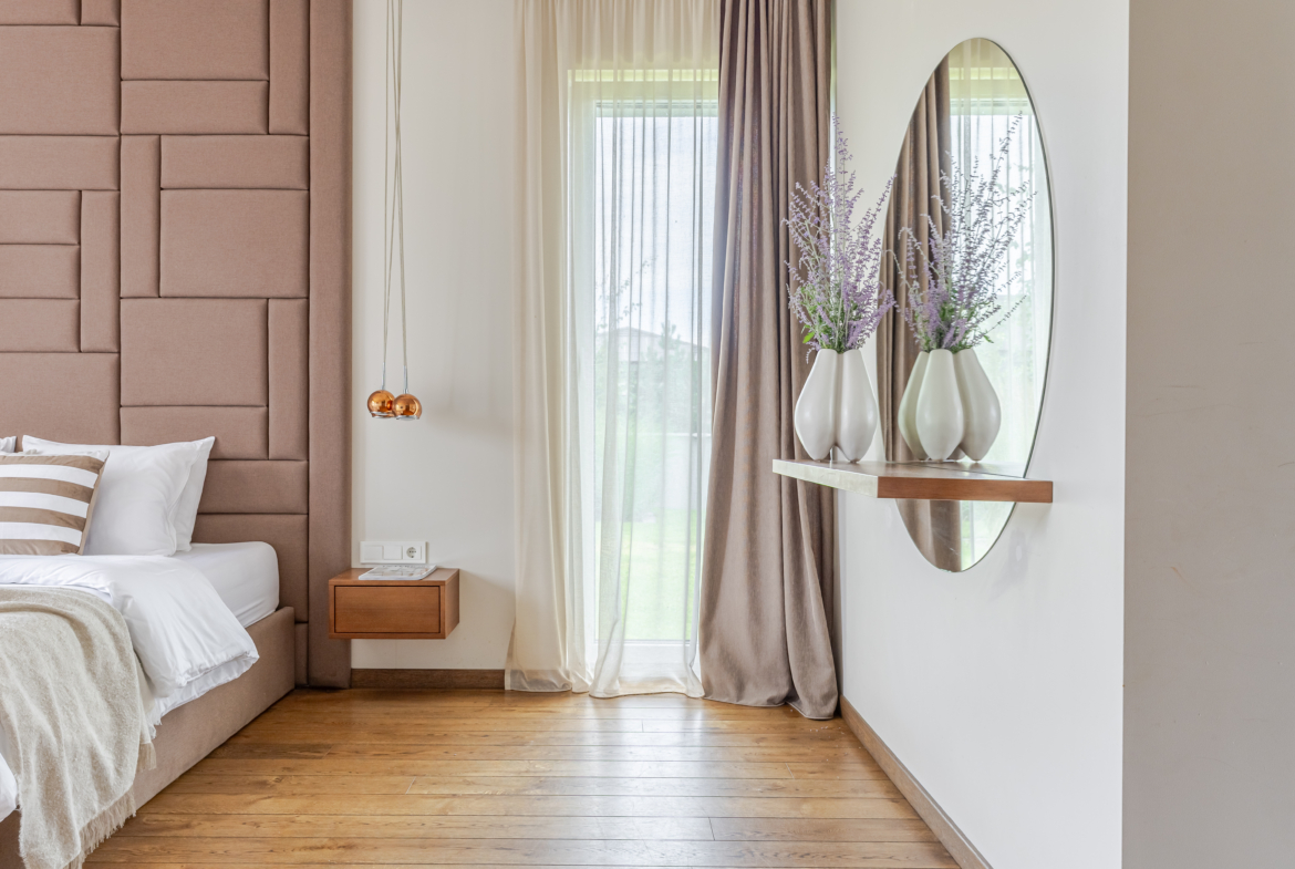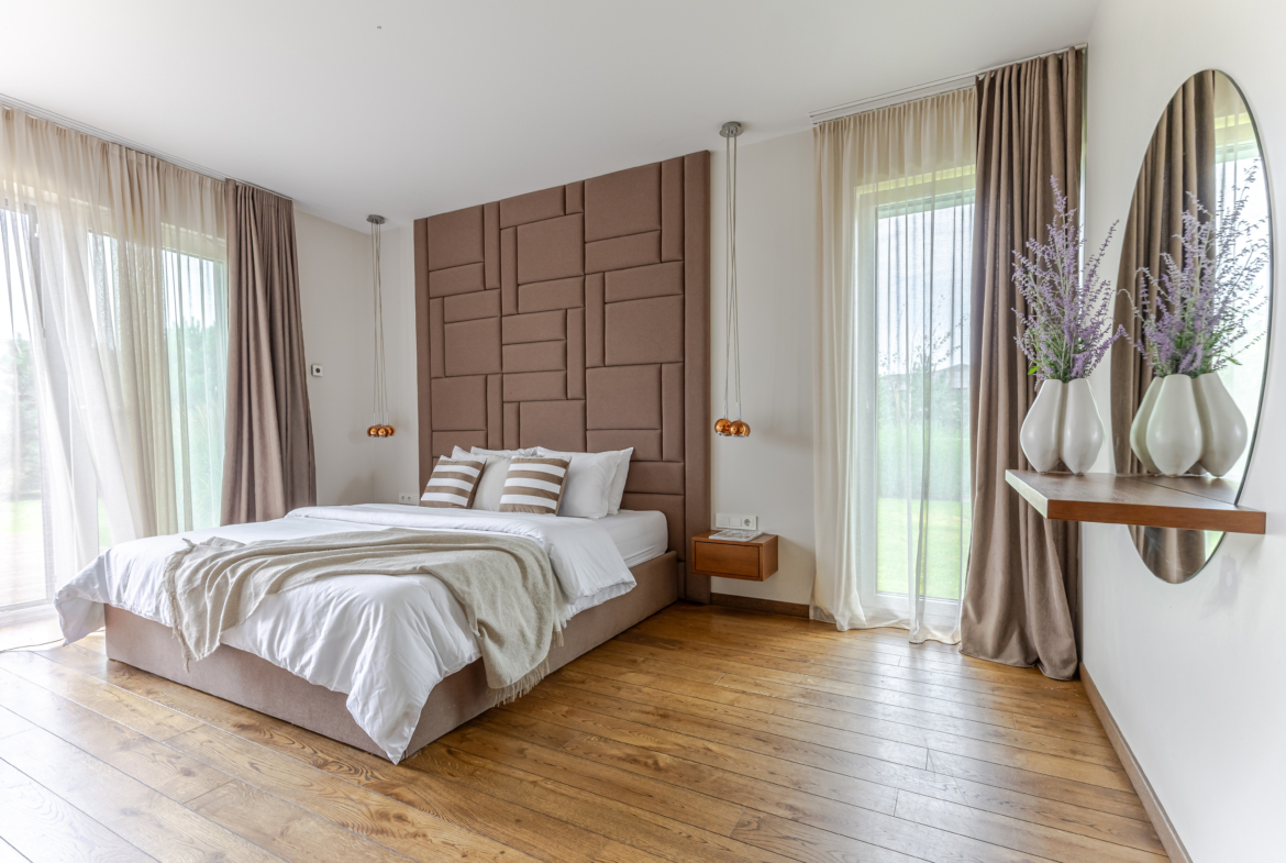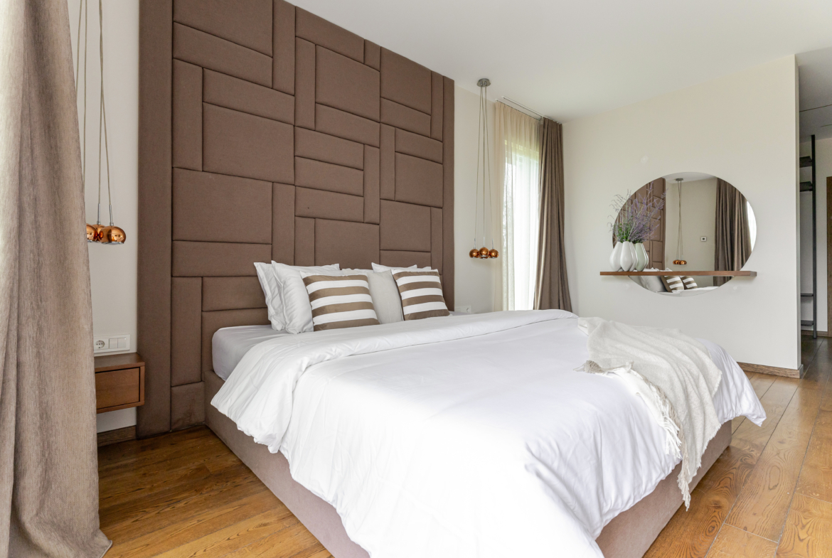 Keturi miegamieji kambariai sukuria jaukias poilsio erdves visai šeimai, o du erdvūs vonios kambariai užtikrina patogumą ir privatumą. Dideli vitrininiai langai ir šviesios užuolaidos pripildo namus natūralia šviesa, o subtilios interjero spalvos kuria šilumos pojūtį. Name įrengtas ir garažas vienai mašinai.