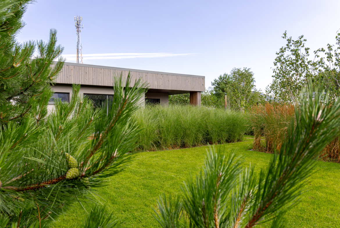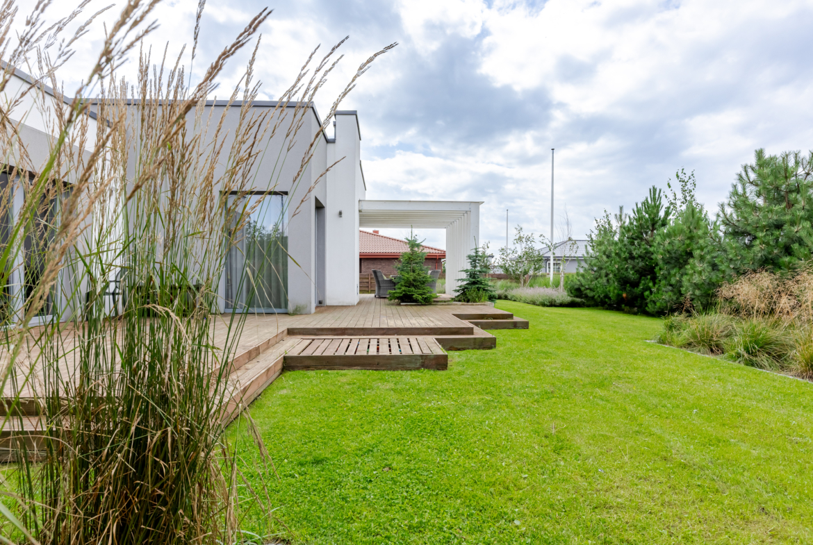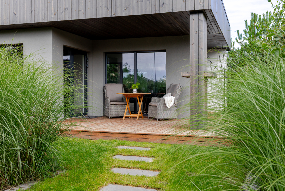 Iš pagrindinės erdvės išeinama į didelę, iš maumedžio pagamintą terasą, atsiveriančią į 15 arų miško pasaką– privatų gamtos glėbį, liūliavimą primenantį smilgų horizontą.